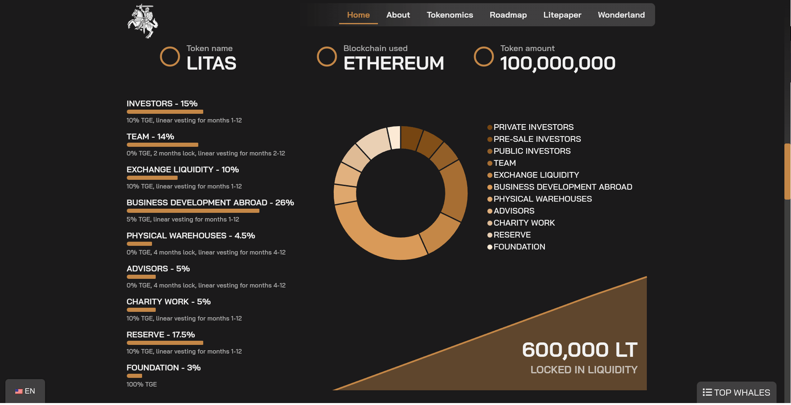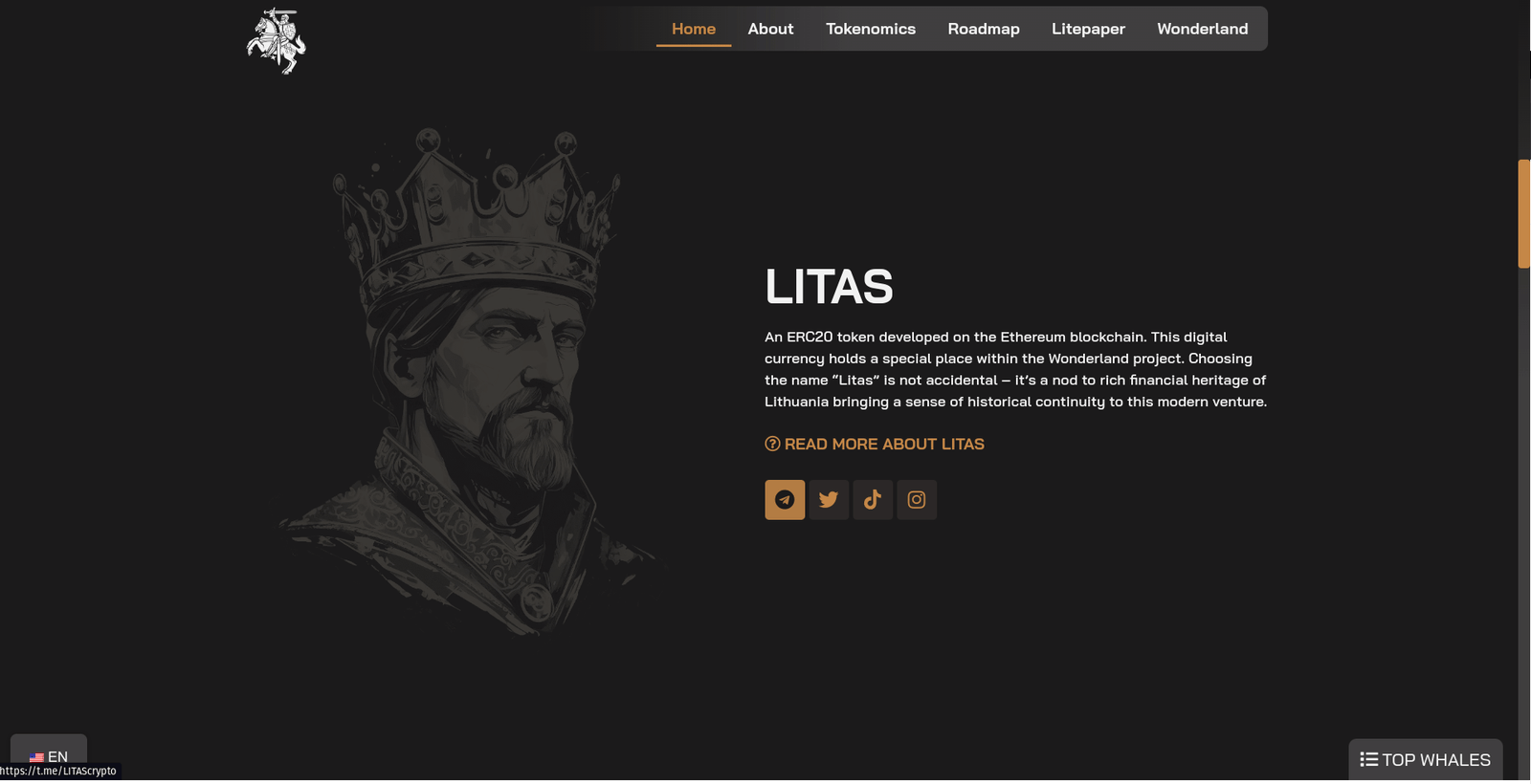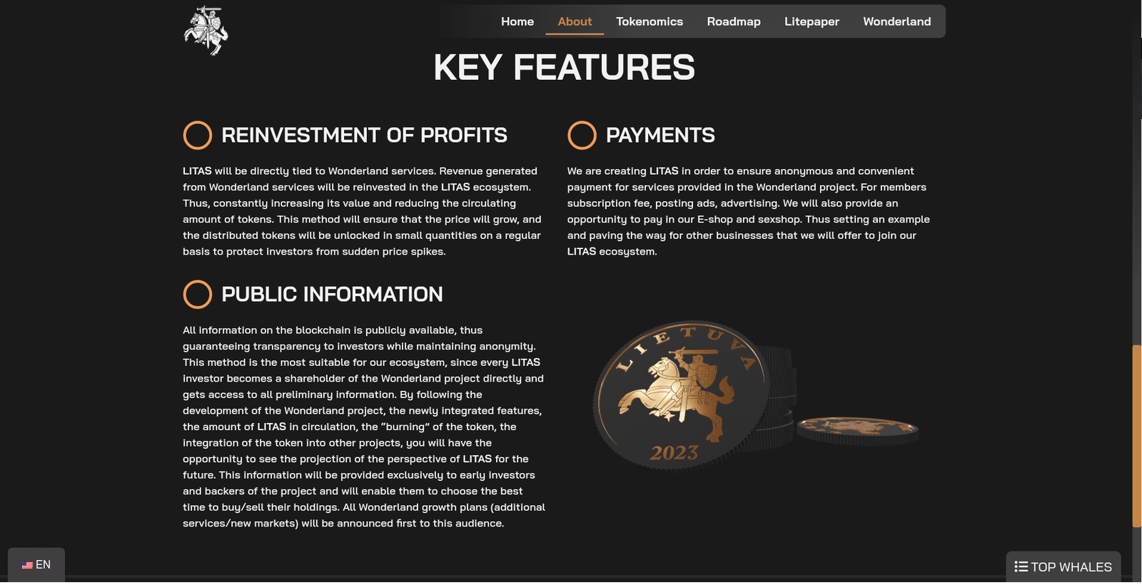 Ši svetainė yra skaitmeninis portalas, skirtas inovatyviam projektui, kuris jungia istorinę Lietuvos valiutą „Litą” su šiuolaikinės technologijos galimybėmis, naudojant Ethereum blokų grandinę. Svetainė suteikia išsamų ir interaktyvų įžvalgą į „Lito” žetoną, jo tokenomiką, ir kaip jis integruojamas į „Wonderland” platformą. Svetainės dizainas yra šiuolaikiškas ir vartotojui patogus, užtikrinant lengvą navigaciją ir aiškų supratimą apie projekto tikslus, planus bei potencialą.